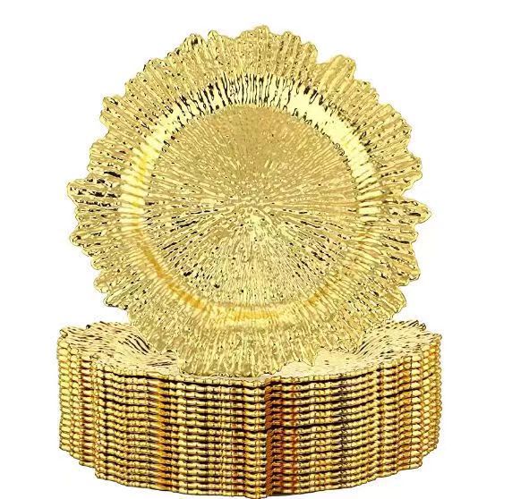 Uniquelina vente en gros assiettes de chargeur à bord rond en plastique de 13 pouces assiettes de chargeur en plastique doré de récif rond doré pour le dîner, le mariage, la fête, la décoration d'événements.