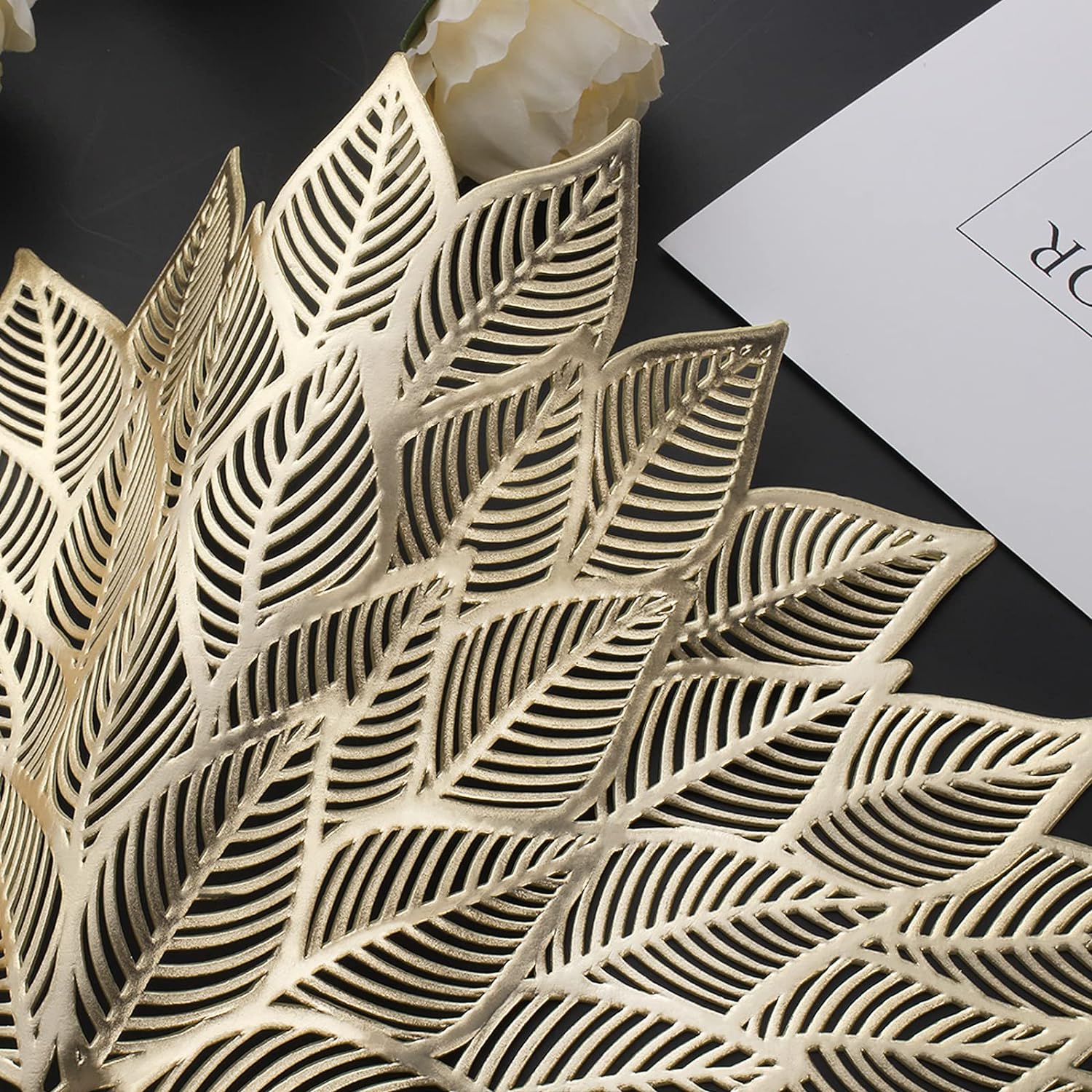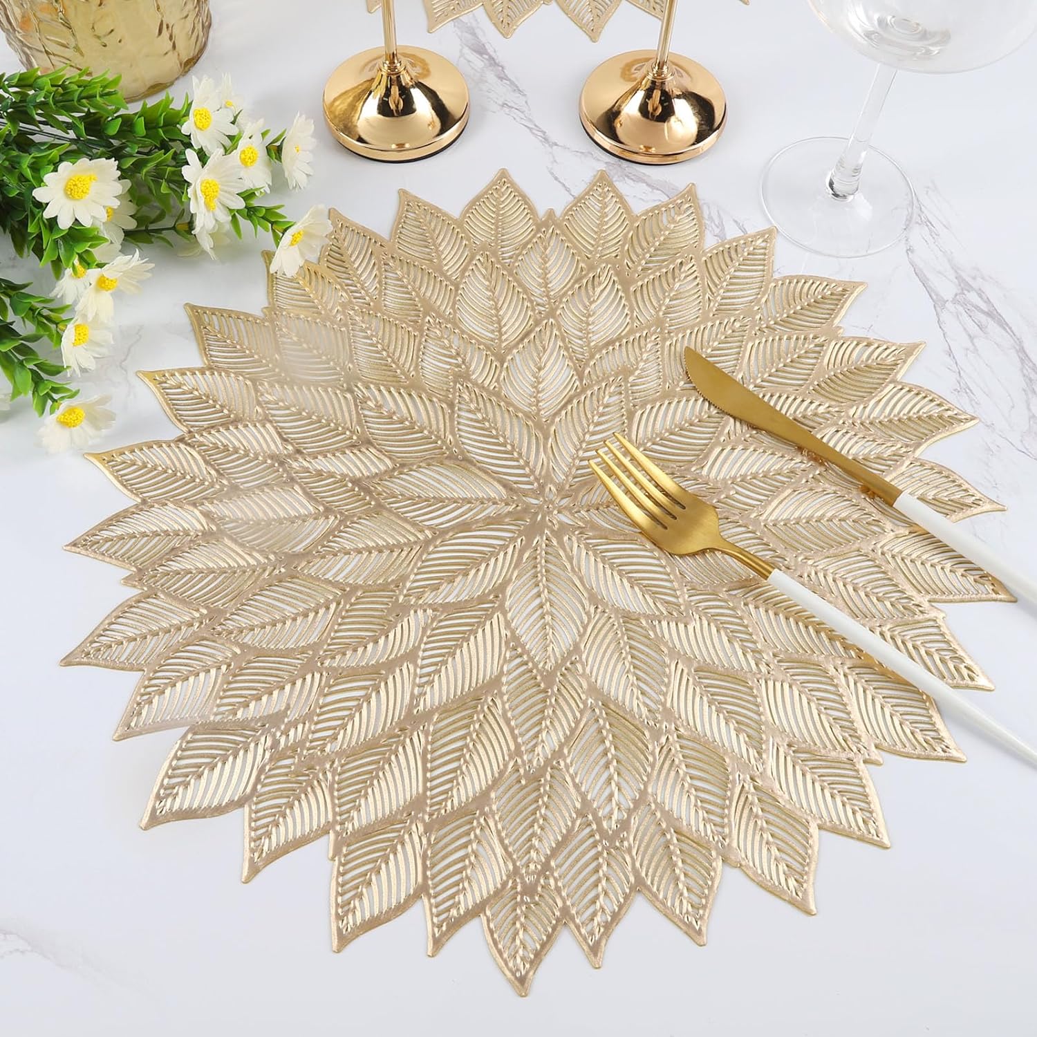 Lot de 12 sets de table ronds ajourés en forme de fleurs pour table de salle à manger en vinyle pressé avec feuilles fleuries pour fête de vacances, mariage, centre de table, décoration de table (doré)